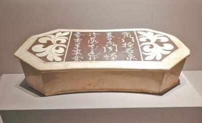 运城博物馆藏黑地白粉书诗文八角枕。图片来自贾尧