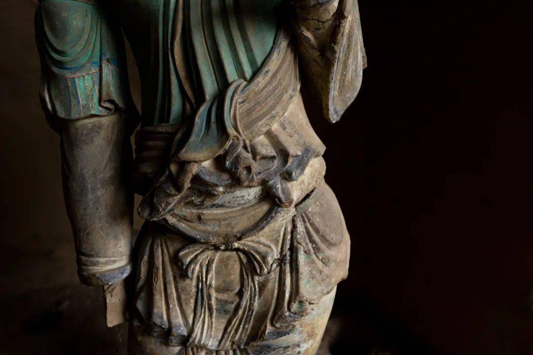 二胁侍菩萨,面形方圆,眉眼细长,鼻梁平直,大耳小嘴;上着甲胄式圆领窄袖短襦,项部束带打结,帔帛斜搭于左肩,并由身后缠绕至腹前作结,下穿紧身长裙,外套束膊半臂衣。臂戴钏,腕绕环,侧身扭头,站在方形台座上,双足已失。其中左菩萨头顶有残损,冠饰遗失。一手抬起举于胸前,一手自然下垂。右菩萨高发髻,双手胸前相托。二菩萨褶襞重叠交错,繁褥多变,流畅自如。衣纹装饰质感轻薄,肢体扭动,体现出人体造型的美感。
