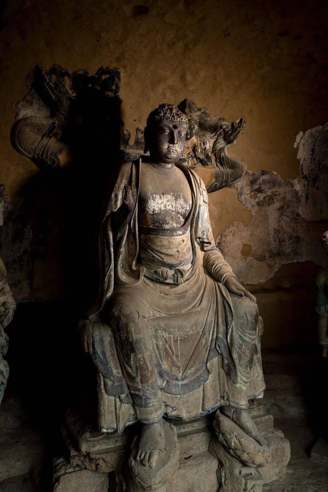 倚坐佛螺髻,方圆脸 ,细长弯眉,双眼微合上斜,鼻小唇厚,大耳短颈,宽肩挺胸;内着僧抵支,外着双领下垂袈裟,下衣贴腿; 双足踏莲,倚坐于工字形坛座上;体态端庄,神情肃穆。佛座后有双龙座椅,为宋代形制。
