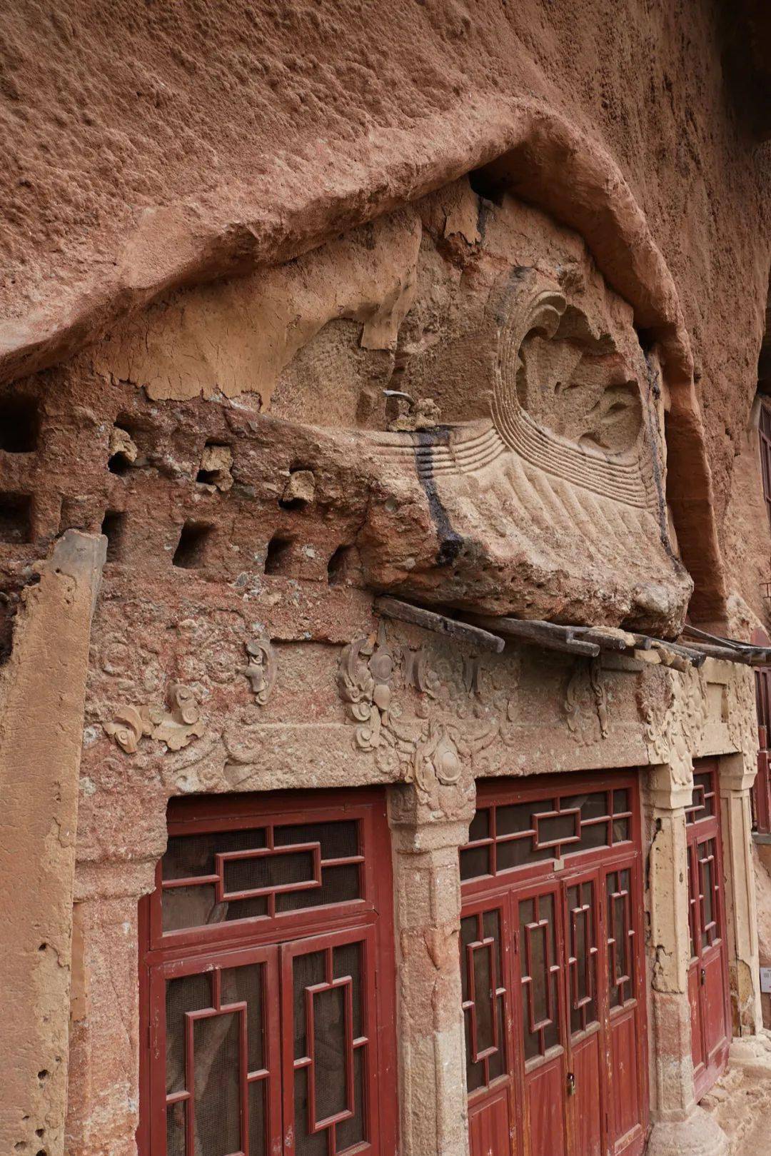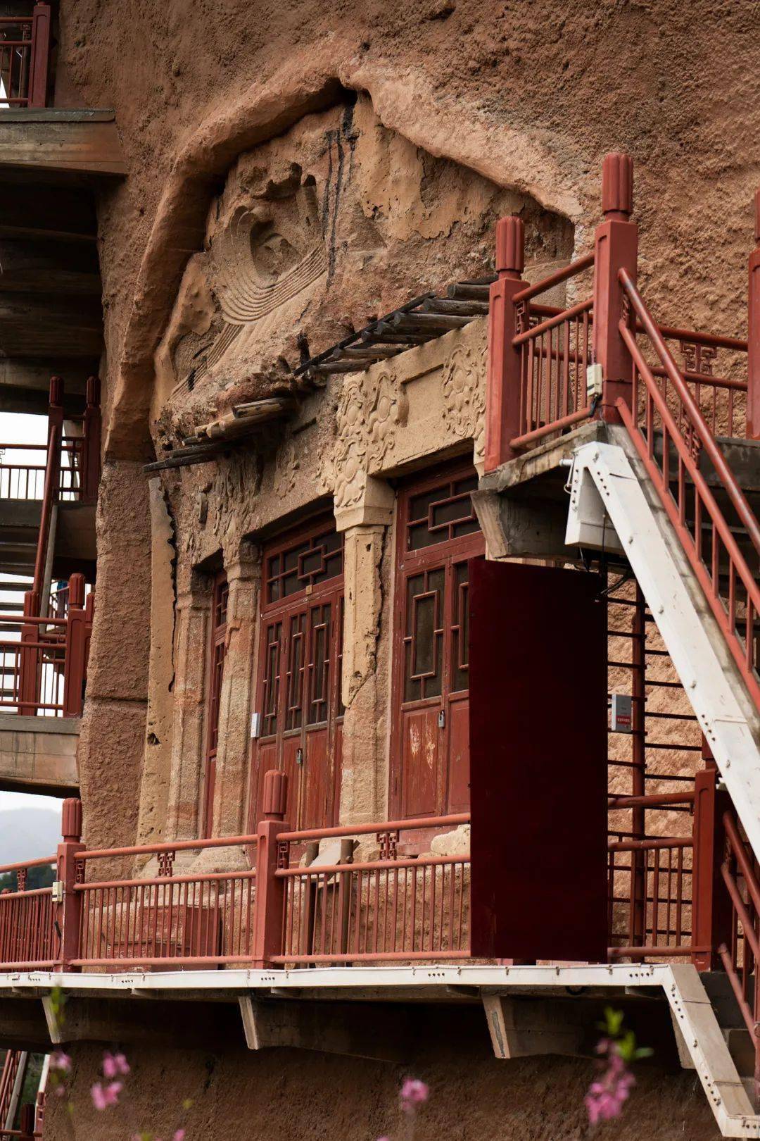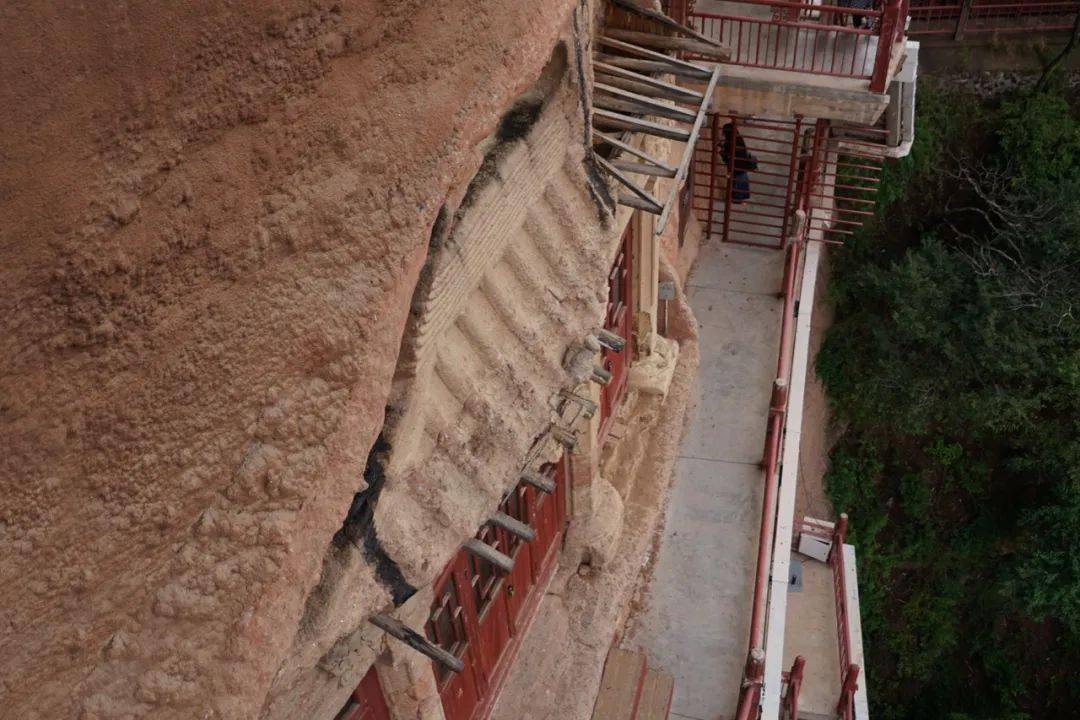 该窟外观为仿木结构建筑三间,前檐三间四柱, 檐柱内有廊。平脊两端处平行线脚上翘并内弯成鸱尾形,是麦积山现存的9个北朝石雕崖阁建筑之一。
