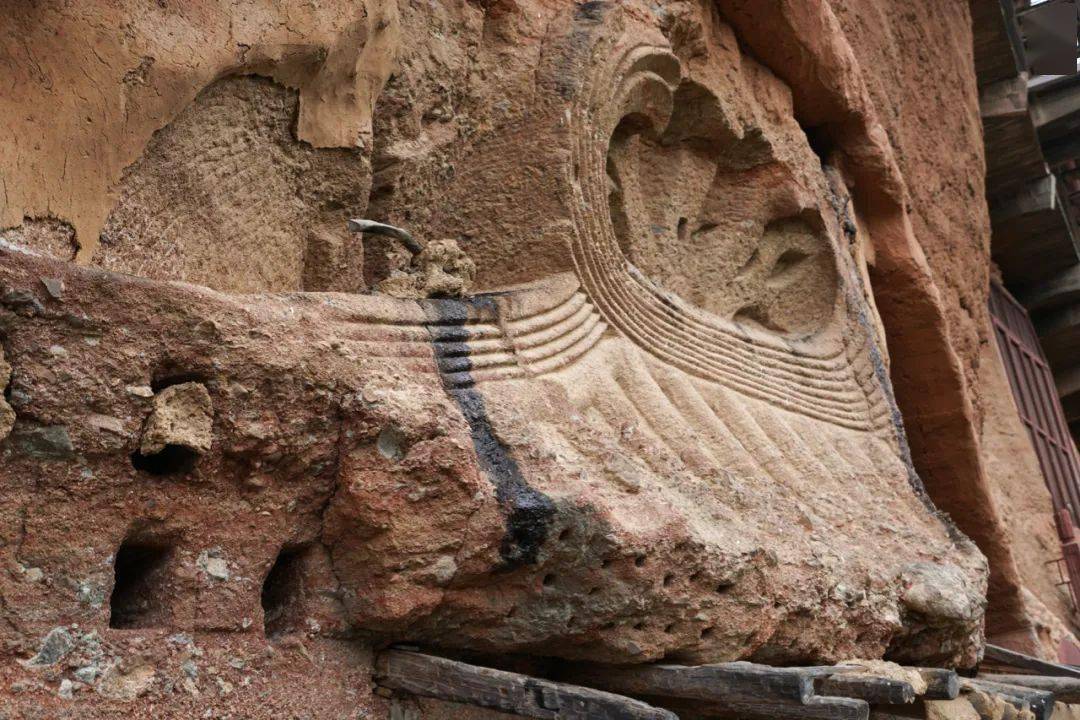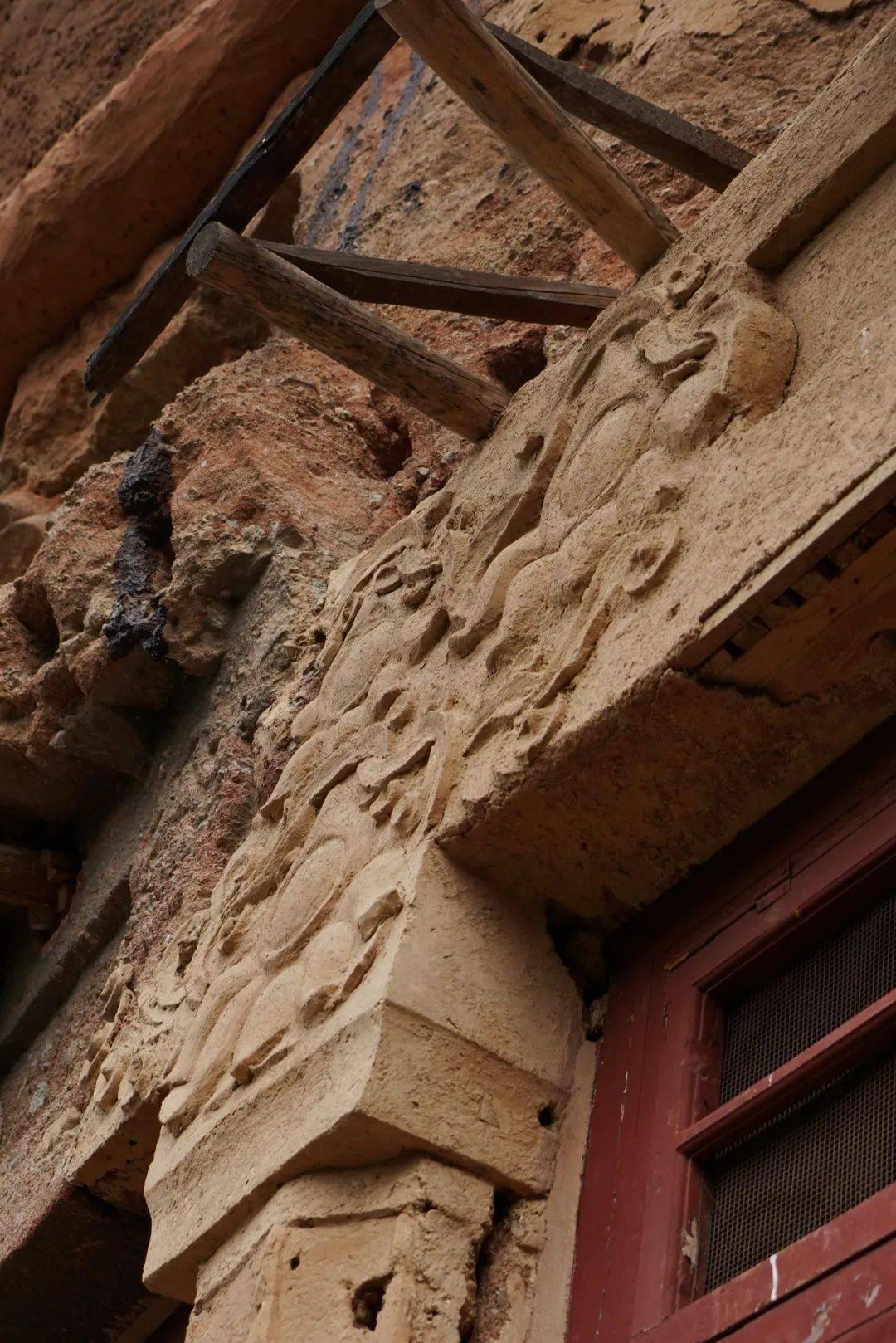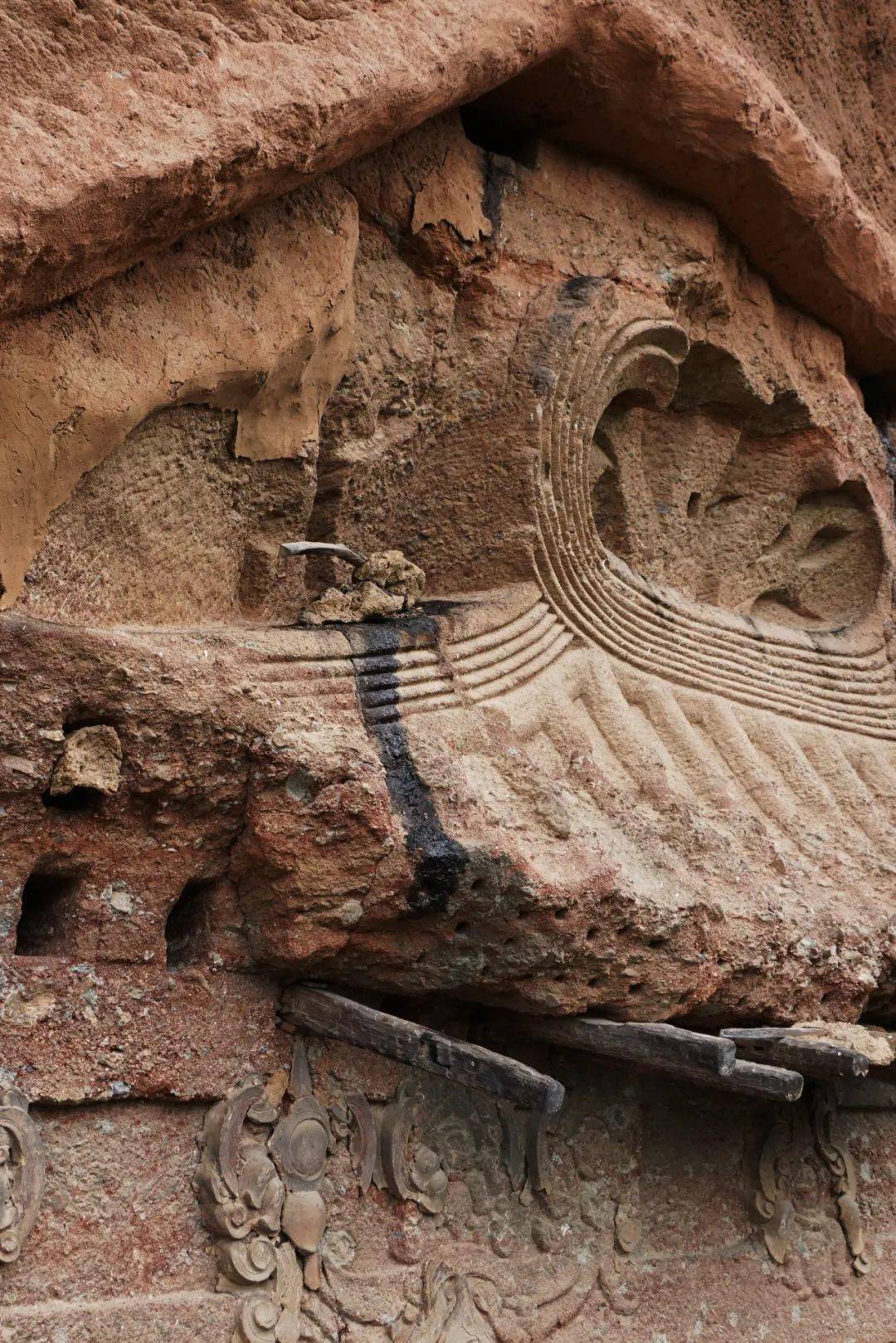 该窟外观为仿木结构建筑三间,前檐三间四柱, 檐柱内有廊。平脊两端处平行线脚上翘并内弯成鸱尾形,是麦积山现存的9个北朝石雕崖阁建筑之一。