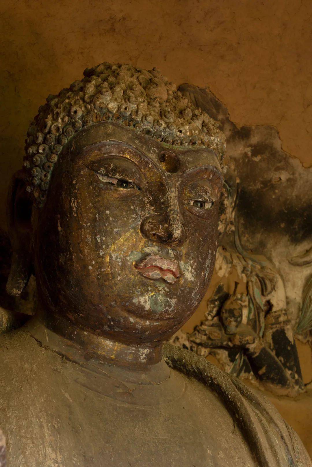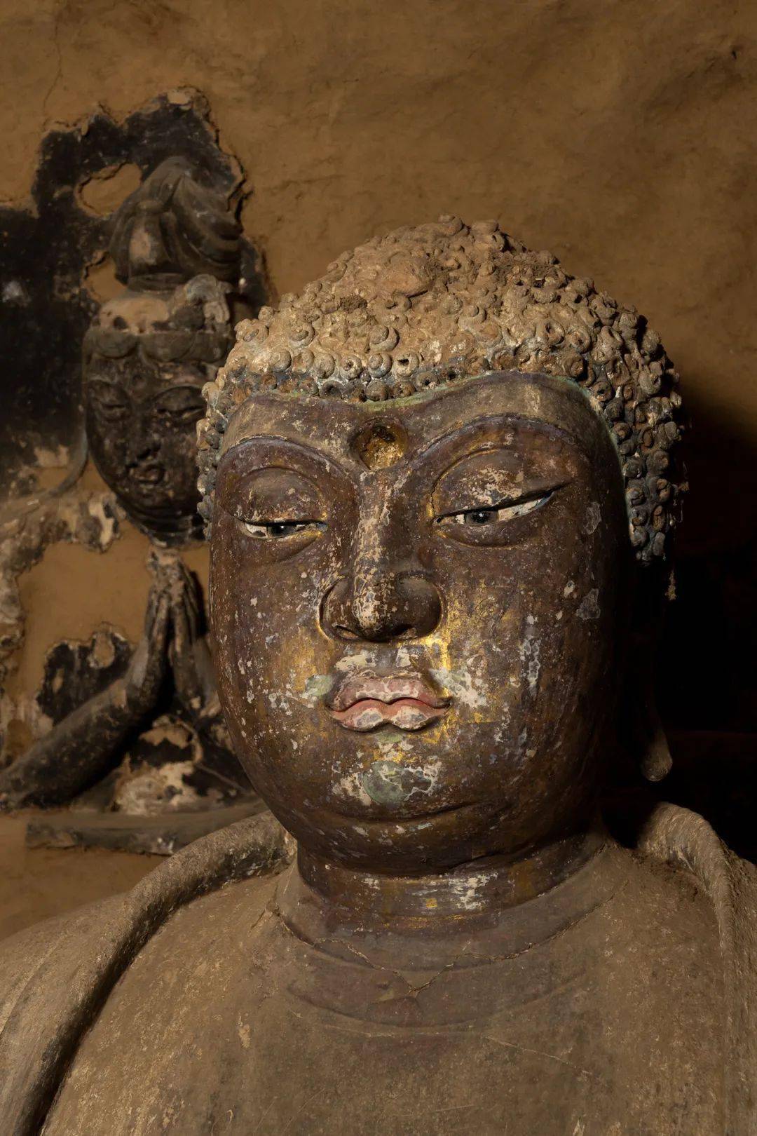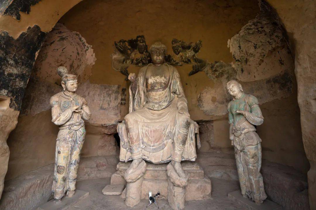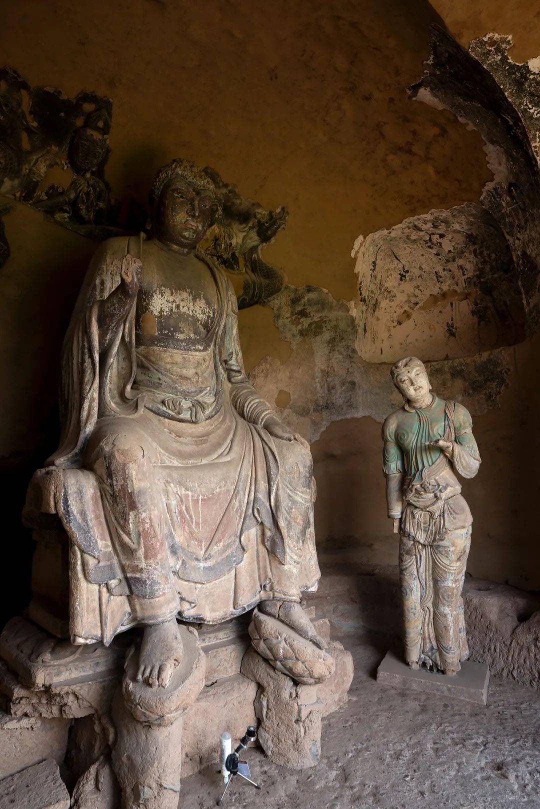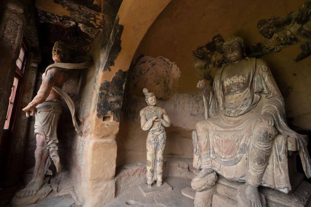 现窟内(前室 )后侧正中塑一倚坐佛,后壁上方高浮塑双龙椅背及两供养菩萨。左右侧前方各塑一身胁侍菩萨,前廊左右侧各塑一身力士,后室内左侧前方立一尊石刻佛像。此窟的倚坐佛在造型风格上与 133 窟的释迦会子主佛造型样式相近,应是同时期所塑;二胁侍菩萨造型特别,据说为五代所塑,宋代重修,其服饰与第4窟第六龛内右侧靠门的菩萨形制相似;前廊二力士为典型宋代风格。