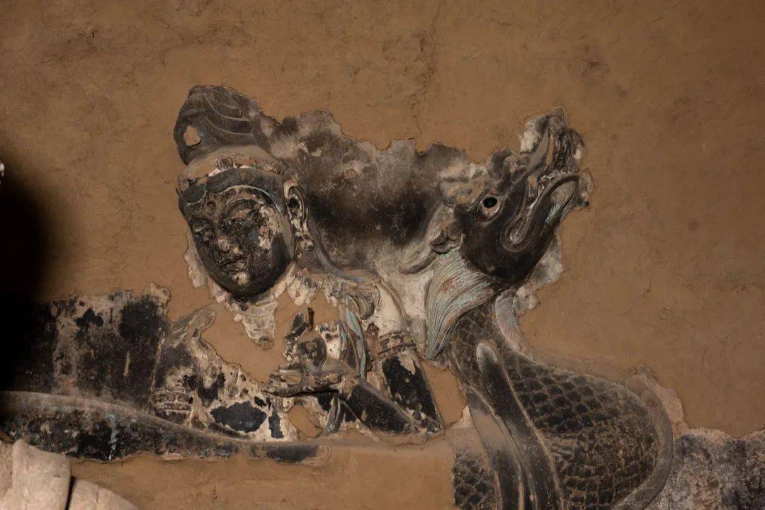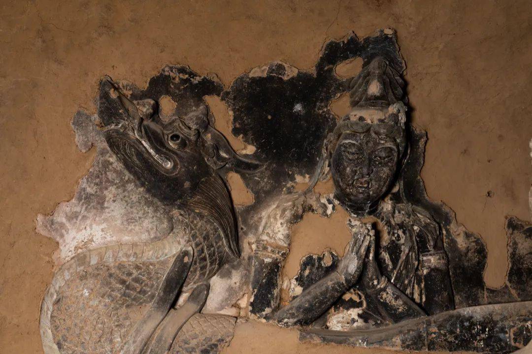 后壁浮雕龙头椅背靠,后塑二供养菩萨,菩萨弯眉丰颐,向下俯视,目光柔和亲切。很多人认为是龙女,但根据现场观测,二龙为椅背与二菩萨不在同一空间,所以称供养菩萨更为合适。