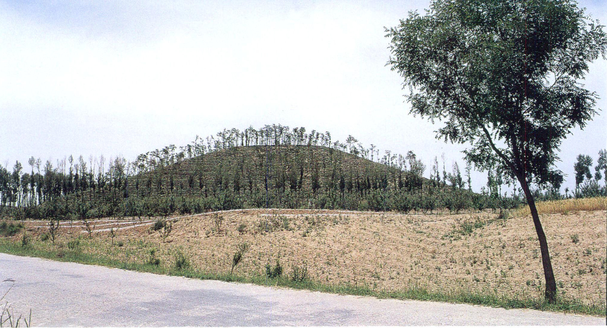 经勘探,云陵陵园平面呈长方形,东西长 337米,南北宽283米。陵冢位于陵园中部,封 土夯筑,呈覆斗形,底边南北长143米,东西宽 135米,高25米。陵园四面各辟一门,门外置双 阙(现存残高1.5~5米),南阙外发现有宽10米 的御道遗迹;陵园四隅建角楼,现东南和西南角 阙址尚存,底径均约15米,残高1米。陵周及阙 址附近堆积和发现有大量建筑遗物,有铺地方 砖、条砖、子母砖、空心砖、圆形和五角形陶水 管道、残板瓦、筒瓦及“卫”和“长乐未央”文 字瓦当以及卵石、草拌泥和不规则形础石等。