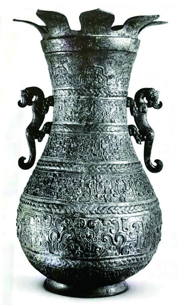 鸟兽龙纹壶周身满布花纹(图5),从上至下依次为饕餮衔凤纹、龙纹和人面鸟纹、兽面纹,纹饰间隔处装饰野兽相噬、雁纹及绹索纹、贝纹。纵观鸟兽龙纹壶器身纹饰,既有充满想象力的人首怪兽、饕餮衔凤等抽象纹饰,也有源于生活、形象生动的写实动物,构思巧妙,细致入微,反映出当时青铜器铸造的高超水平和审美。
