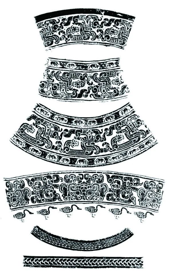 壶口沿至底部装饰的四道宽带状纹饰中,前三道均为蟠龙和人首、兽体、鸟尾的怪兽相互缠绕的形象(图6)。人面鸟嘴的造型,在辉县琉璃阁墓地出土器物上多次出现,故宫博物院收藏的龟鱼纹方盘上装饰的人首鸟身图案也与此相似。这种题材最早见于公元前8至公元前6世纪叙利亚亚述帝国王宫浮雕和斯基泰文化遗物中,或许与西亚、中亚地区文化的传播和影响有关。而在中国,这种人面鸟喙的形象也有记载。《山海经·海外南经》提道:“大荒之中,有人名曰驩头……人面鸟喙,有翼,食海中鱼,杖翼而行。”《山海经·南次二经》:“有鸟焉,其状如鸱而人手,其音如痹,其名曰鴸鸟,其名自号也,见则其县多放士。”《山海经》成书于商周至春秋时期,制作于相近时期的青铜器上出现类似的纹饰,既是古人吸收外来文化并转化利用的成果,也是当时信仰和精神世界的反映。
