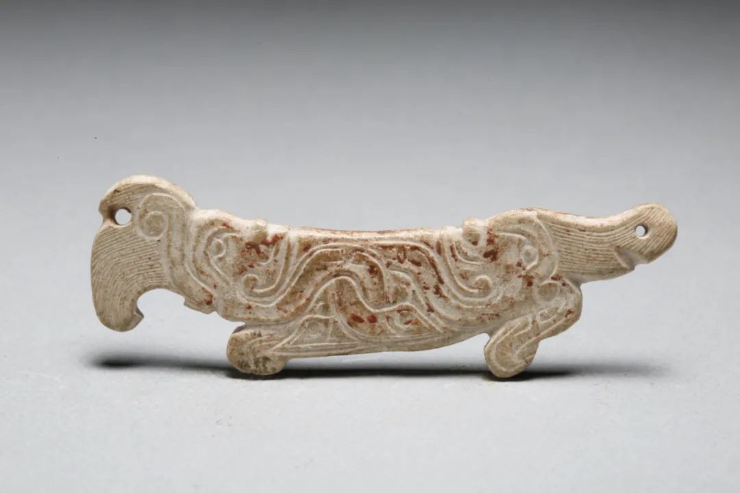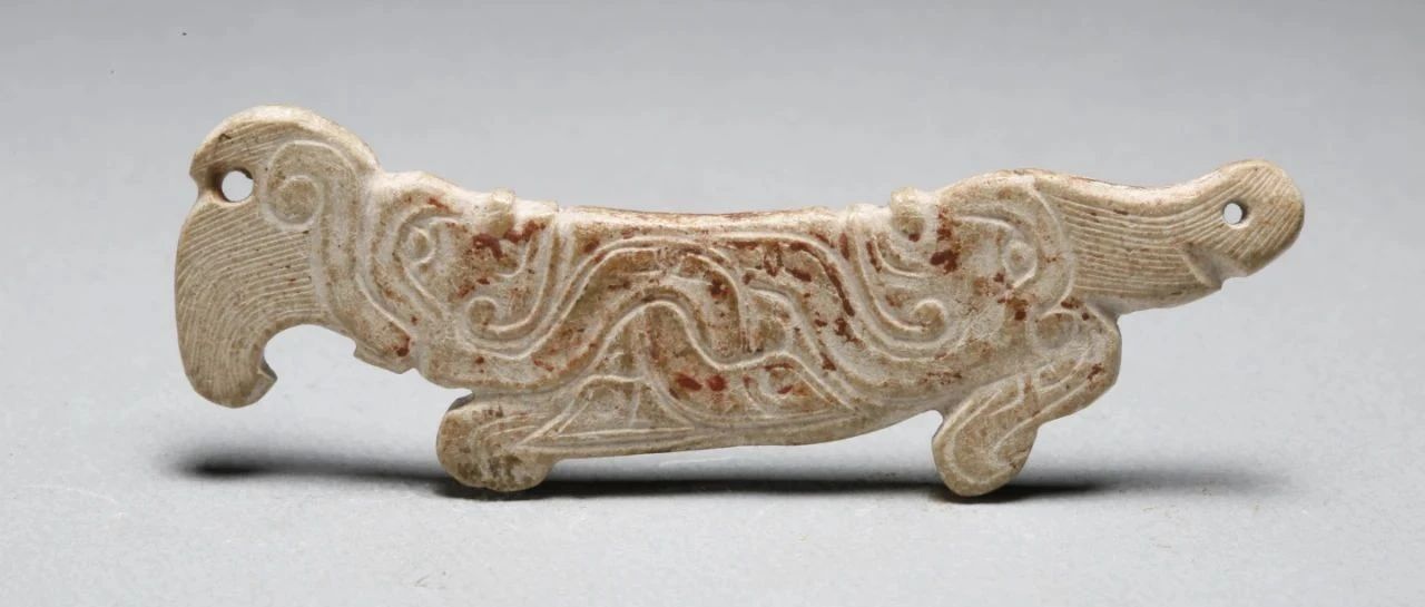 关于伏羲女娲的形象,不同时期的古文献都有记载。《楚辞·天问》中写道:“女娲有体,孰制匠之?”东汉王逸注:“女娲人头蛇身。”《山海经·大荒西经》郭璞注:“女娲,古神女而帝者,人面蛇身,一日七十变。”从史料中可以看出,伏羲女娲通常都是以“人头(首)”和“蛇身”的形象出现。虽然我国还有很多记载伏羲女娲传说的文献典籍,如《庄子》《风俗通》《春秋》等,但相关文献、文物的发现多集中在战国后期及汉唐,且多以壁画、石刻和绢帛画为主,先秦时期的文物中却鲜有实物能与之相印证。虢国贵族夫人墓出土的这件玉兽,恰与史料记载完全相符,为“人头(首)蛇身”,这补充了史料记载与汉墓石刻的空白。