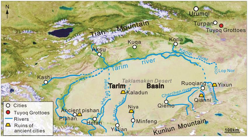 但是在盆地北缘,受阻于当地的蒙古人种族群,吐火罗人在这里定居,完成了从游牧经济向农耕经济的转型;日后,这里的吐火罗人形成了两个历史悠久,文化灿烂的吐火罗人国家:焉耆和龟兹。直到今天,这两个王国的名字,都留在了汉语地图之上。塔里木盆地的吐火罗人相对稳定地保留了原始印欧人的文化特征,而那些游牧征战的吐火罗人的文化面貌和人种特征,则会长期处于变化状态。