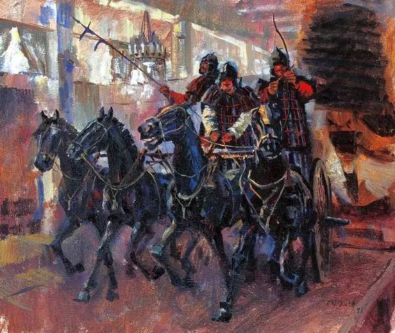 《左传》中不乏对于君子们在战场上的种种特写,比如铁丘之战中,有赵简子被战戈扫中头盔,震碎牙齿、被敌箭射中肩膀的惊险一幕;鄢陵之战中,楚共王、吕锜、养由基等人进行过对射单挑,楚共王目睹了郤至的勇猛,派人送礼表示对他的赏识,而郤至三次碰到楚共王,都从容不迫地下战车,脱下头盔,快步向前而走向使者肃拜。然后继续上车履行职责;而晋厉公看到对面的子重指挥有方,也派人给子重献酒,子重在将酒一饮而尽之后,继续击鼓指挥,表示自己愿意继续接招迎战。