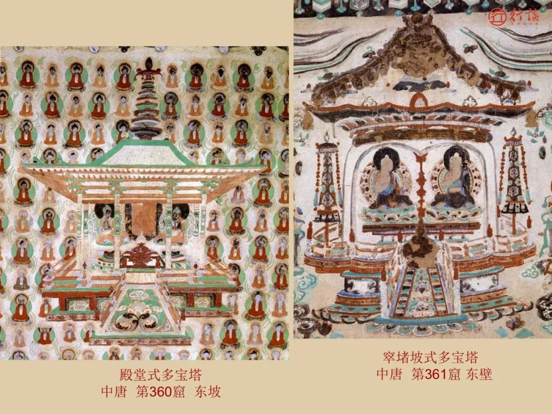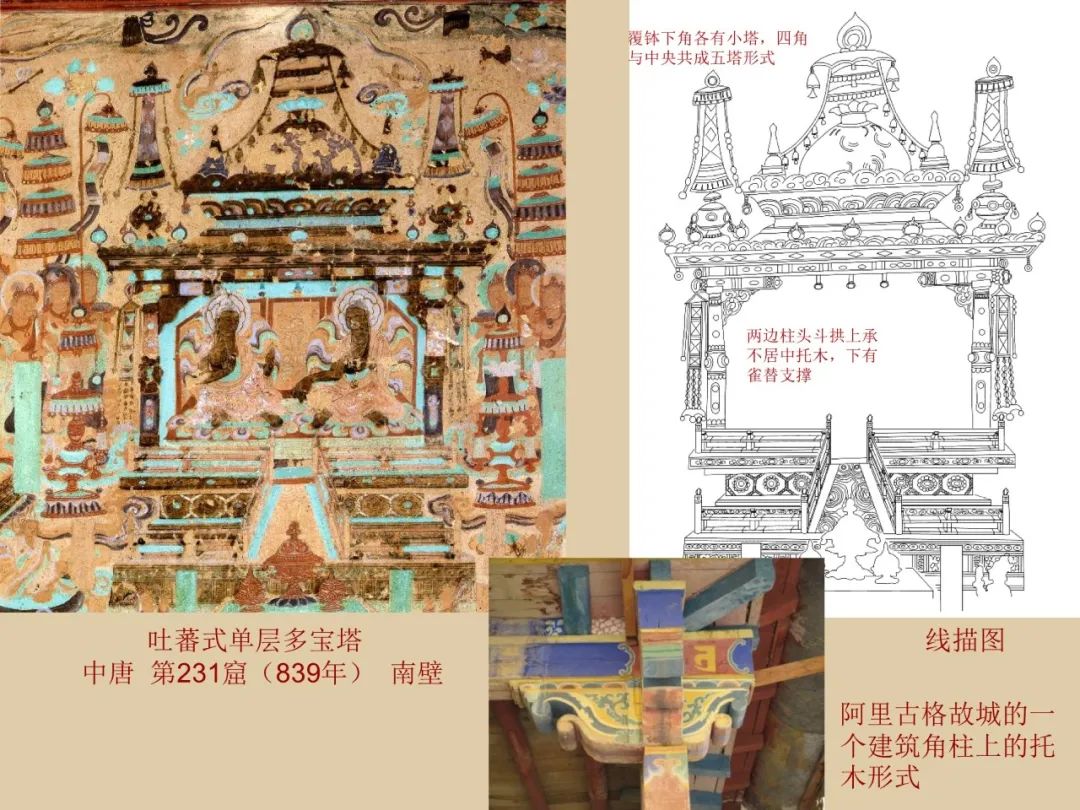 莫高窟第428窟(北周)壁画中出现了有壁带的塔。壁带,是指壁中露出像带一样的横木,其加固的功能类似于现在钢筋混凝土建筑中的圈梁;第254窟(北魏)著名的舍身饲虎图中可以见到带有中国建筑元素的塔,从透视角度看,塔基是平视效果,而塔身则是俯视效果,使其在整体构图上达到了一种不符合常规透视规则的特殊视觉平衡;而在第231窟(中唐)南壁壁画中的吐蕃式单层多宝塔,则见到了以覆钵配合小塔的五塔形式为顶的塔,两边柱头斗栱上承托不居中替木,下有雀替支撑,与阿里古格古城的一座建筑实物形制非常接近。※相轮:相轮是塔刹的主要部分,位于塔刹的中段。它是一圈一圈的环,环环相连,用在塔上作为种仰望观瞻的表识,起着敬佛的作用。