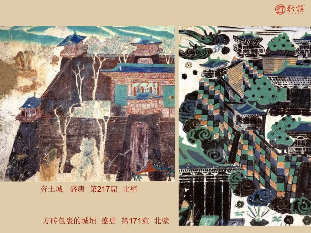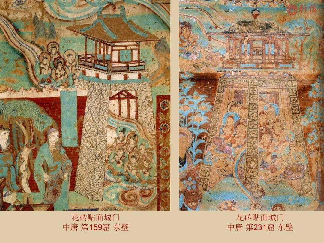 垣式壁画中出现频率较高的一种建筑类型,初唐的夯土城、中唐的菱形花砖城门墩台,都是当时建筑形制的生动体现。城门等级最重要的表现形式就是城门道的数量和城门前的“棨戟”制度。在莫高窟第172窟(盛唐)南壁,王宫城门前排列旗、戟的形式,反映了唐代为具有一定地位的重要建筑门前或三品正职官员宅邸门前陈列戟架的一种礼仪制度。唐代墓葬中淮安郡王李寿墓和懿德太子墓壁画中都出现了棨戟的图像,这与当时的等级制度是相符的。南北朝时期壁画的城墙上还绘出了雉堞与突出的马面。雉堞是古代在城墙上面修筑的矮而短的墙,可借以掩护自己。马面是外城墙每隔一定的距离就突出矩形墩台,以利防守者从侧面攻击来袭敌人的结构,这两种城防设施,将城垣的防御功能作了高度的概括。(莫高窟第257窟(北魏)、第249窟(西魏)。释迦牟尼是印度迦毗罗卫国净饭王的太子,因此,佛教故事多以古印度宫廷为背景,进行了丰富的描绘;而民居是最常见又难以长期保存的建筑类型,在壁画中出现的民居形象更显其珍贵。在莫高窟第217窟(盛唐)南壁上可以见到汉地、西域两式民居一墙之隔,汉式民居大门是乌头门,西域民居则是在屋外搭起胡床,这种胡汉杂居的形式,是当时社会生活的真实写照。