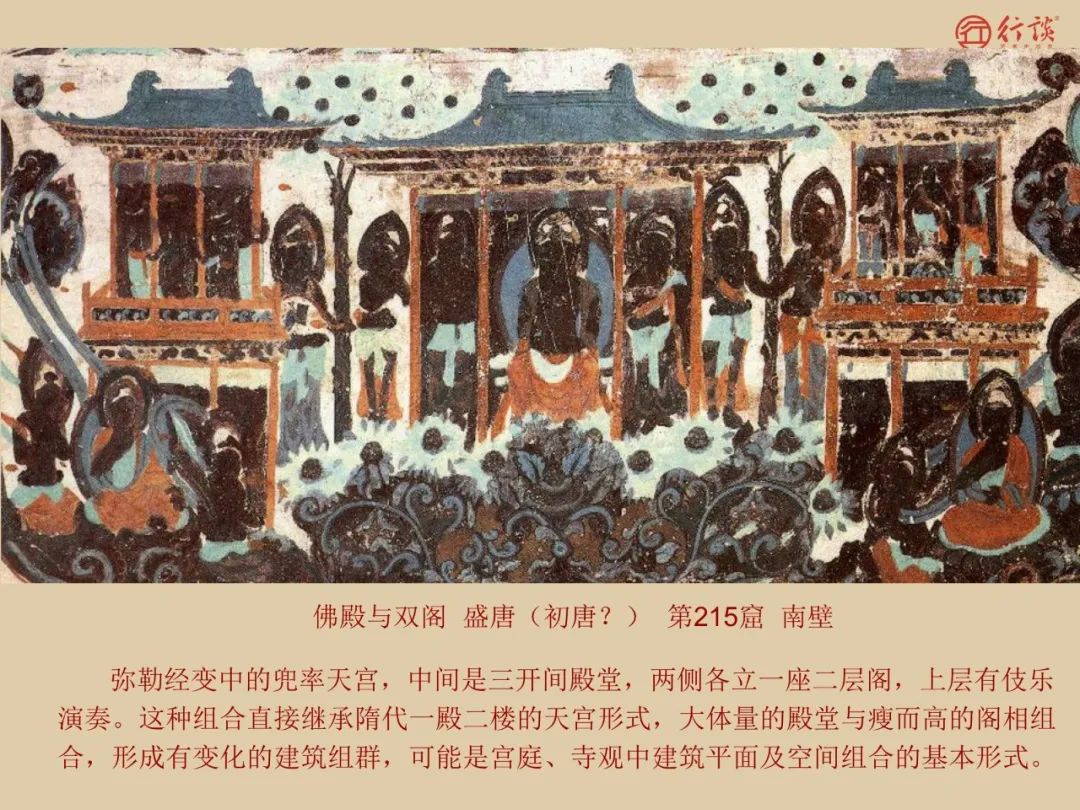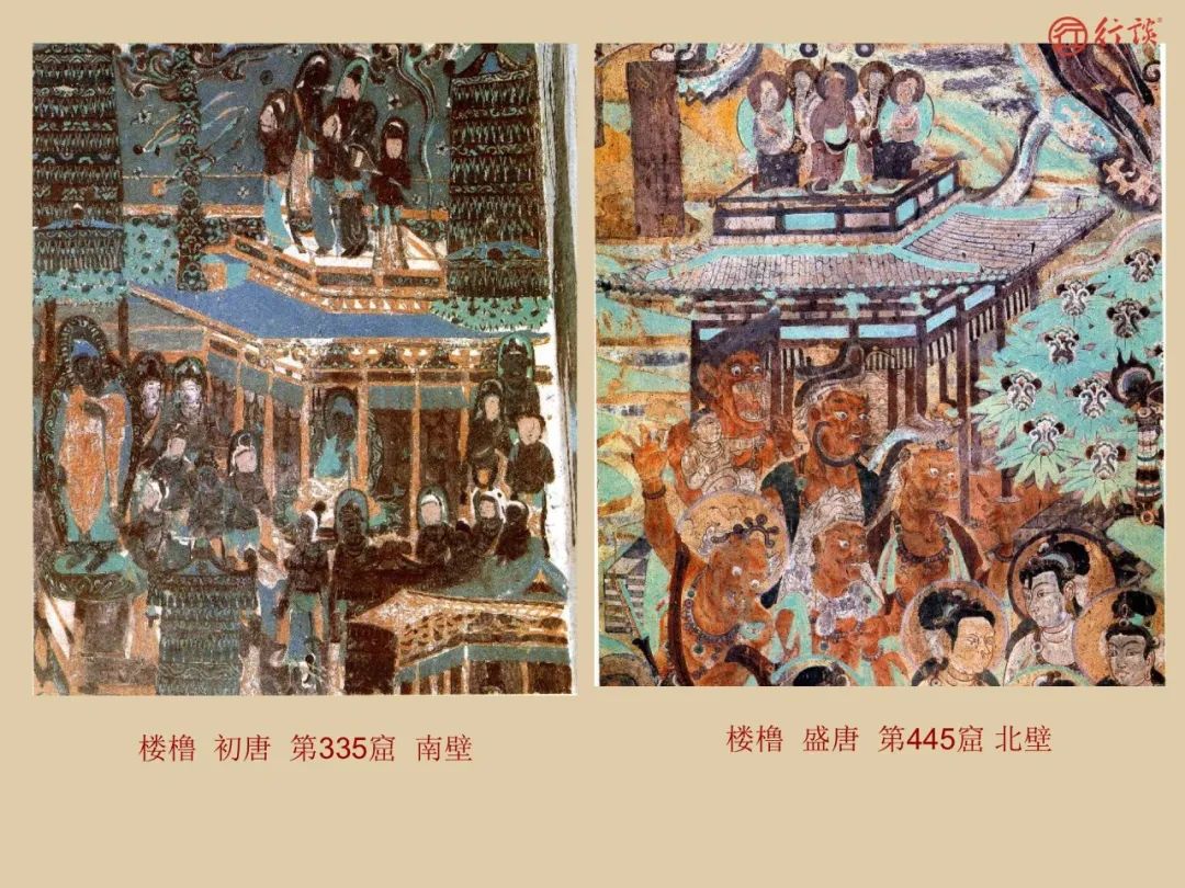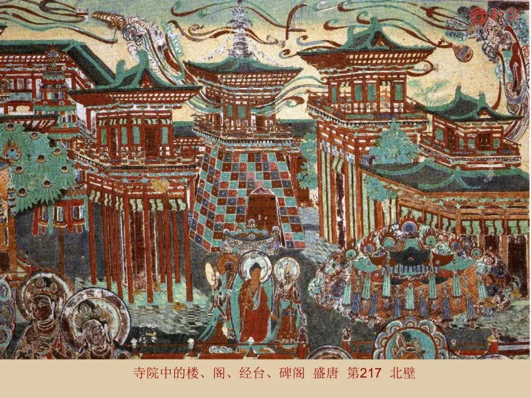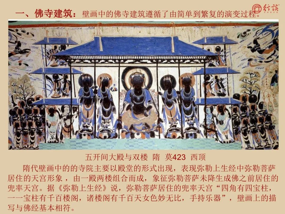 隋代壁画中的寺院主要以殿堂的形式出现,在莫高窟第423窟(隋代)的西顶,由一座五开间大殿与双楼来表现弥勒菩萨尚未降生成佛之前居住的兜率天宫形象;而在莫高窟第215窟(初唐/盛唐)南壁中表现的兜率天宫,则在隋代的基础上发展为中间三开间殿堂,两侧各立一座二层阁的建筑群组;莫高窟第225窟的阿弥陀佛净土变展现了盛唐时期的建筑特征,殿与楼之间用S形曲廊相连,构成了凹形寺院的主体建筑群,这种布局是壁画寺院的基本格局,广泛应用于寺院中。塔是完全由西域传入的一种建筑形式,是伴随着佛教的传播与发展而产生的,是壁画中变化最多的一种建筑类型。常见塔式有窣堵坡、殿阙式塔、多宝塔、七重楼塔、天宫塔院、舍利塔等等。装饰从最初朴素的光面造型,逐渐发展到建筑构建上出现彩绘,形象逐渐趋于华丽,仔细观察也会发现很多有意思的细节。