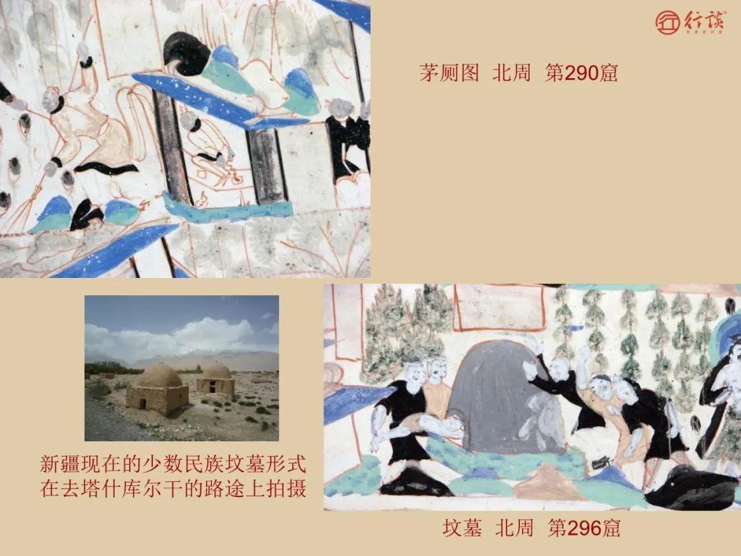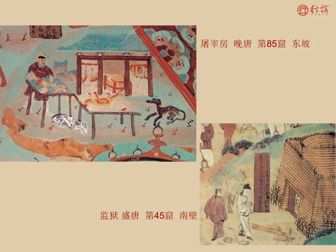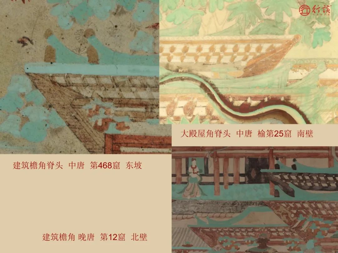 另外,在壁画中我们还可以看到灯楼、照壁、学堂、栈道、茅舍、屠宰房、监狱、茅厕、坟墓等建筑类型,可以看到修庙建塔的过程描绘(莫高窟第296窟(北周)),并从中分析出工人的分工和等级、使用的工具,施工方法,更可以细致的观察建筑的细部结构并展开思考:比如古建筑屋顶的脊兽是我们耳熟能详的,那么在唐朝建筑中,屋顶垂脊瓦饰又是什么样子的呢?※莫高窟第172窟(盛唐)北壁三重大殿屋顶脊头