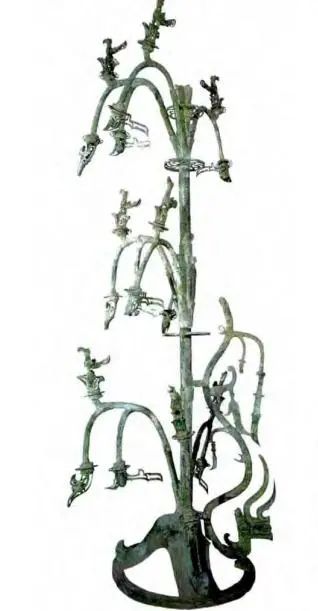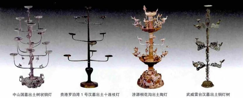 青铜连枝灯又称为多枝灯、枝状灯,被研究者认为是青铜树的一种变体。三星堆文化发现商代青铜树后,在河北平山中山国墓中也曾发现一盏战国时期的树状铜灯。铜灯粗壮的主杆向四方伸出14个枝干,每个枝头托着1个灯盏,鸡和类似人形的猴子在枝干上嬉戏玩耍。基座由三虎承托,虎口衔环,透雕螭龙纹,上有二裸人,一手托食物,一手向上抛食喂猴。与三星堆青铜神树相似的是,多枝灯主干上也有螭龙盘绕其上。尽管多枝灯是按不同功能和目的制造的,但它的14个灯盏向四面八方提供光亮,这一设计可能是受到了古代神话传说中的扶桑与若木的启示。灯杆上盘绕的龙,枝上嬉戏的猴、鸡以及喂食的裸人俨然一派妙趣横生的山林情景。此后,灯与树的造型出现了愈来愈多的交集。广西贵港罗泊湾1号汉墓出土有一件十连枝灯,造型比中山国墓出土的那件简单,但顶部灯盏有一只鸟则与青铜树极为相似。