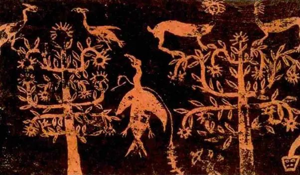 《山海经》中颇具代表性的神树有扶桑、若木和建木等。扶桑、若木分别是太阳升起、降落的地方,扶桑在东方,若木在西极。《山海经·海外东经》说:“汤谷上有扶桑,十日所浴,在黑齿北。居水中,有大木,九日居下枝,一日居上枝。”《淮南子·地形训》曰:“若木在建木西,末有十日,其华照地下。”