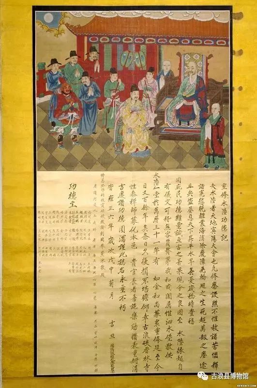 古浪县博物馆收藏的这套水陆画,是一套珍贵的明代绘画作品,共42幅,除中央的3幅大佛像外,其余均高约260厘米,宽约110厘米,以细绢为底,用藏蓝和黄色团花花绫装裱,绘制精美,装帧考究,大部分画面清晰,保存完好,少数因受潮或被烟熏,绢色变暗或稍有裂纹。2004年由甘肃省文物局立项统一组织修复,它既是美术艺术研究,又是历史考证方面珍贵的实物资料,曾被专家誉为“可移动的敦煌莫高窟”。