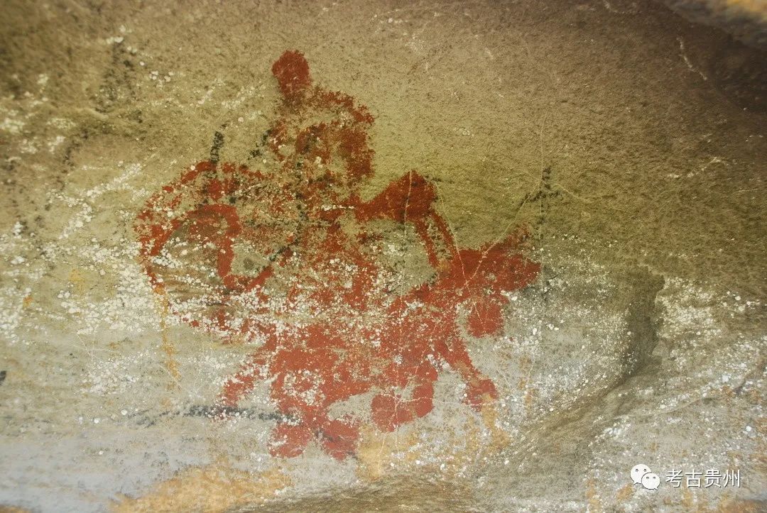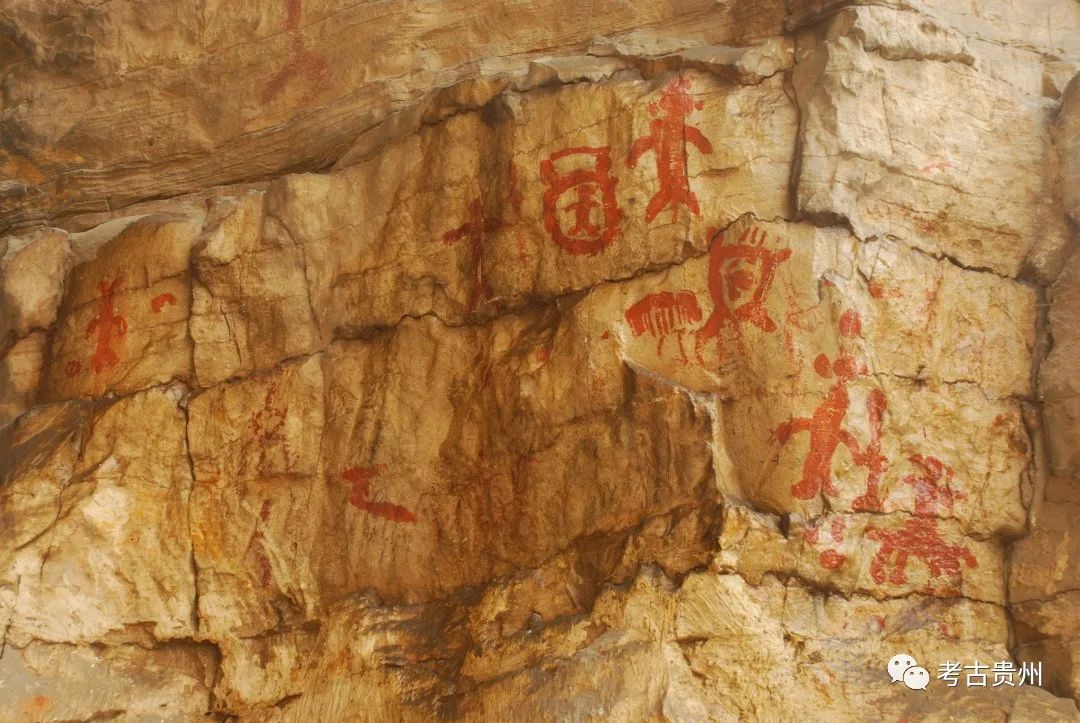 洞穴遗址内除采集到陶片、打制石器和动物骨骼等遗物之外,还在部分遗址洞口处的崖壁上发现有用赭红色或红色涂料绘制的岩画,这种被誉为“凝固在岩石上的历史画卷”的岩画在东起大海之滨,西达昆仑山口,北至大兴安岭,南到左江沿岸的广袤地域皆有发现;我们如若把范围缩小到贵州,则是,迄今在黔中、黔南、黔西南、黔北、黔东南、六盘水和铜仁地区皆有发现,但其分布点尤以开阳、贞丰、龙里、惠水、长顺等地最多,它们表现了战争、祭祀、欢娱、农耕、生殖等方面内容。