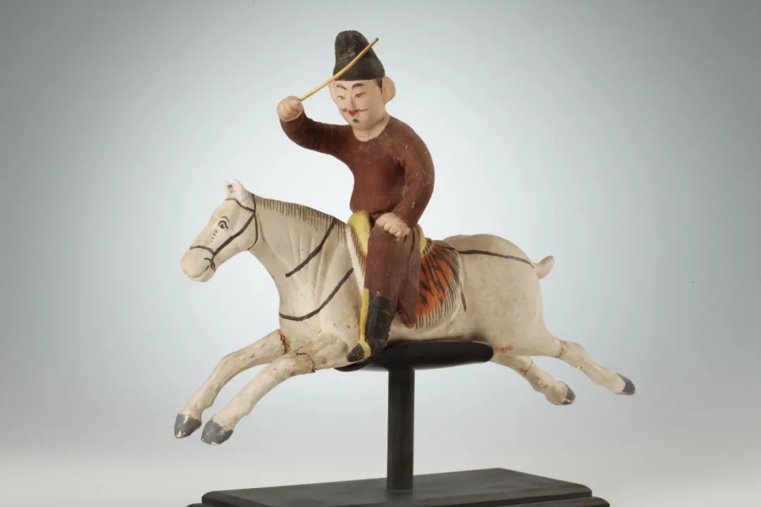 吐鲁番出土的这件“打马球俑”不仅展现了驰马挥杖强体魄的大唐雄风,也是多元文化交流的见证。它为研究唐代马球运动的各类规则及唐代服饰文化提供了详实的实物资料。(新疆维吾尔自治区博物馆 张紫琪)