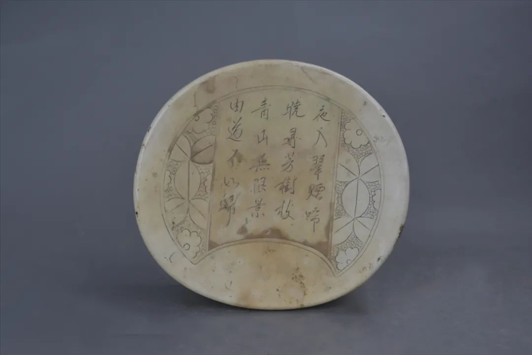 ● 还有一类是直接在枕面刻划文字。如一件书写北宋诗人范仲淹《越上闻子规》的瓷枕,以月牙形壸门开光搭配传统的珍珠地划花技法,枕面阴勾双线半月形边框,内被竖向双线分割,中间勾划诗文,左右划花叶纹,衬以珍珠地。除了对原诗文的直接引用,还有一些即兴发挥,以契合匠人自身想表达的意境。枕面书法多俊秀老辣,用笔章法考究,显示出书写者深厚的书法造诣。