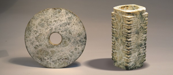 良渚文化玉璧,现藏于良渚博物院(左);吴家埠遗址出土良渚文化玉琮(右)。 图片来自叶一念