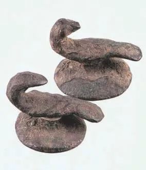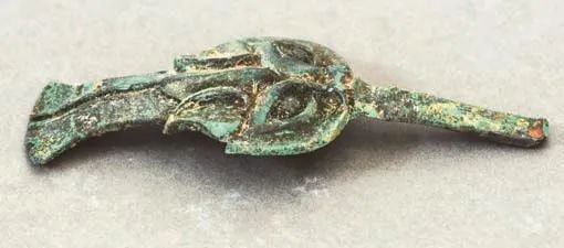 汉代鸟形铜带钩(一对),现藏于许昌博物馆。其中一件长2.7厘米,高1.9厘米,钮直径2厘米;另一件长2.7厘米,高1.8厘米,钮直径2.3厘米。钩首呈鸟形,鸟身上羽毛清晰可见,钩钮当座,鸟儿卧在其上,仿佛真的就是一对在枝头歌唱的百灵,造型生动、逼真(图3)。有关资料显示,较短的带钩数量很少,流行时间较短,仅在三国初期出现,可见这对短小、精巧的鸟形铜带钩的稀缺和珍贵。