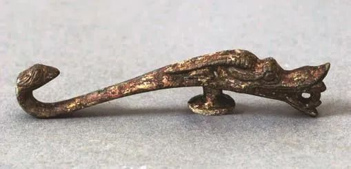 战国龙形鎏金铜带钩(图4),现藏于许昌市文物考古研究管理所。带钩长10.7厘米,宽0.95厘米,高0.75厘米,钮直径1.7厘米。带钩整体为龙形,通体鎏金,局部鎏金已脱落。钩首为回望螭首,也是龙形之尾,钩尾塑成龙首。龙有双角、双耳,双眼圆睁,龙嘴大张,露齿含珠。钩钮在龙颈下面,靠近钩尾。此带钩造型线条流畅、简洁粗犷,是带钩中难得一见的精品。