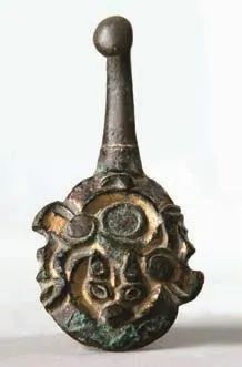 战国鎏金兽面纹铜带钩(图2),现藏于许昌博物馆。带钩长8.6厘米,宽3.8厘米,厚1.2厘米,钮直径1.1厘米。钩首为回望蛇首,钩身呈长扁条状,钩尾为兽面纹,圆形钮在钩尾部正中,整体造型似中国传统乐器阮。兽面双眼圆睁,双耳耸立,凸鼻。镶嵌物已脱落,鎏金部分也局部脱落。器物造型轻巧,做工精良。