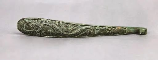 汉代曲棒形铜带钩(图9),现藏于许昌博物馆。带钩长17.3厘米,宽1厘米,厚1.6厘米,钮直径1.5厘米。钩首似回望螭首,整个钩体为细长条,呈圆弧状,钩钮在钩体正中,造型简洁、流畅。