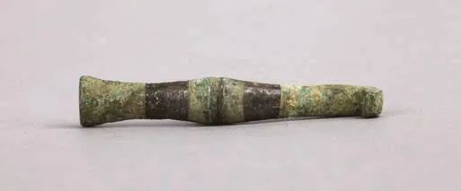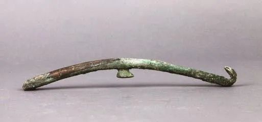 曲棒形和竹节形铜带钩整体似一根长棒,稍有弯曲。曲棒形铜带钩较长,竹节形铜带钩相对较短。