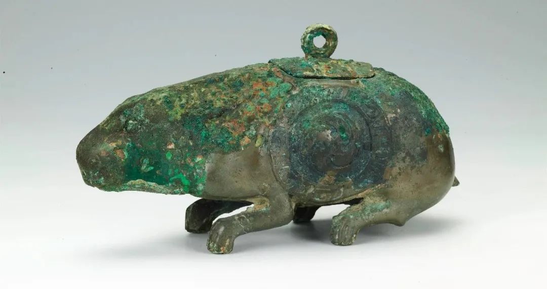 3000年前,兔子的“身影”就出现在甲骨文中,张着嘴巴,长耳短尾,从雕刻精湛的河南安阳殷墟妇好墓中出土的玉雕兔和山西灵石旌介村出土的玉兔看得出,我国古人驯养兔子的悠久历史。而西周晋国诸侯家里的青铜兔尊(图1)正用它发力的四肢和紧贴的耳朵,表达了世界这么大,我想去草原上撒个欢儿的决心。胡傅温酒樽(图2)展示的一众奔跑的动物中,矫捷灵敏的兔子丝毫不落下风,兔子捣药金箔饰片(图3)里的兔子甚至还得了份捣药的差事。