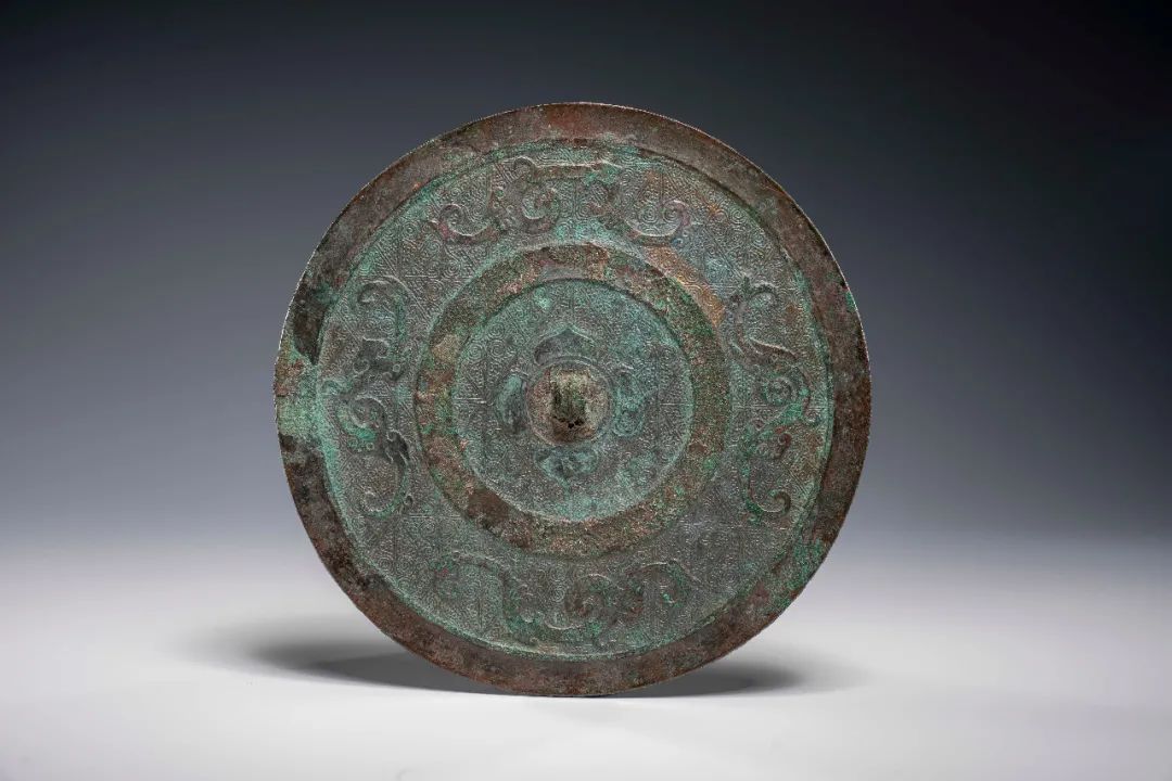 “海上生明月,天涯共此时”,虽不能把玉兔“收入囊中”,却可以在光滑的铜镜中看到皎洁的秋月。战国时期的四龙纹镜(图4)精巧灵秀,反映了古代先民的图腾崇拜文化。唐代铜镜整体造型丰富,双鸾花鸟纹镜与双鸾双花纹镜展现了两只鸾鸟曲颈展翅的清丽柔婉,凤纹镜后则是一只羽翼逶迤的独舞凤凰,簇六团花纹镜和双鱼纹镜洋溢着盎然生机。