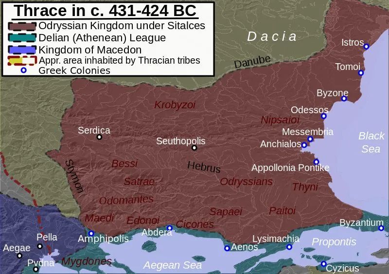 公元前445年,西塔尼克斯继承了父亲的王位,并在公元前429年与斯基泰国王开战。此后,多瑙河就成为双方边界。这个联合王国的国库年收入达到了800塔兰特之多,相当于鼎盛时期的雅典帝国年金。在伯罗奔尼撒战争之前,雅典就针对斯特鲁马河谷发动过9次远征。结果都在严酷气候和色雷斯人的顽强抵抗下终。