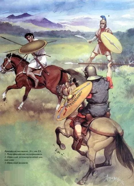 迎战罗马的色雷斯山民武装最后在公元46年,残存的色雷斯-撒皮埃国王被罗马人取缔。在新帝国成型后的几十年里,他们一直以内战状态为罗马城里的执政者所注意。许多山民依旧会造访周边区域,干些顺手牵羊的打劫活动。但除了西面山区的达契亚外,南方已经是罗马的马其顿、达玛蒂亚和亚该亚省,东面的克里米亚半岛也有军团驻扎。哪怕暂时孤悬的几个希腊城市,也都在道义上接受罗马保护。事情发展到这步,色雷斯地区被彻底兼并也就不足为奇了。
