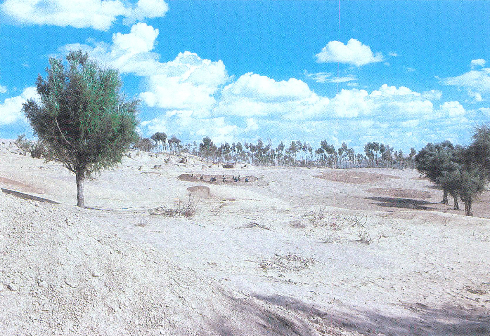 五庄果墚遗址位于陕西省靖边县黄蒿界乡小 界村西北部,距离县城约30公里。遗址面积约30 万平方米以上,文化内涵以仰韶晚期至龙山早期 遗存为主,还有少量周代墓葬。遗址中心位于五 个连绵的山峁之上,相传遗址所处位置曾经有过 五户人家居住,因而得名“五庄果墚”。从地理位 置来看,遗址已经处于明长城外缘,毛乌素沙漠 南侵带来的风沙覆盖了遗址大部分面积,如今满 目所见,已是黄沙遍野,满目苍凉。由于长年的 水土流失及风沙盛行,遗址大部分原生地层已经 遭到破坏,地表支离破碎,沟壑纵横,陶片随处 可见; 有些区域则被厚厚的沙子覆盖了起来。