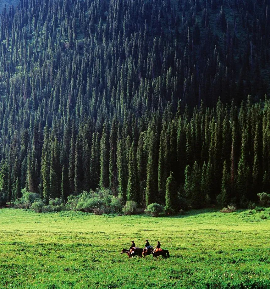 天山最为典型的代表性植物是雪岭云杉,这是天山林海中特有的一个树种,仅在天山有所分布。它们的树高普遍超过50米,有十几层楼的高度。在天山深林的深处,它们苍劲挺拔、绵延而生,成为天山最绮丽的风景线,堪称天山森林的精华。传说中的天山雪莲也在此生长,它们在零下几十度的高山严寒和极度缺氧的环境中顽强生长,这种及其特殊的习性注定它是一种极度稀有的植物。目前天山雪莲已被列入国家二级濒危植物。如此巨量的珍稀动植物,造就了天山独特的自然生态,这座“神秘之山”,正是自然之美的绝佳见证。绝美、珍贵、珍稀,并不是天山的全部特性,它还是我国重要的生态屏障。它在我国横贯新疆中部,把新疆隔绝成了南疆和北疆,也为干旱的新疆荒漠带来了丰富的水源。冰川、河流、草原...生机开始在荒漠中萌芽。由于青藏高原拦截了水汽,于是在天山南侧、青藏高原北侧催生了我国最大的沙漠——塔克拉玛干沙漠,这里终年少雨,年降水量不足100毫米,本应是一片贫瘠荒芜之地,却在天山的滋养下,孕育出了片片绿洲。库尔勒香梨、阿克苏苹果...这些绿洲水果,是天山最温柔的馈赠。在天山的守护下,来自北方的寒潮无法侵入南疆,使得南疆成为了我国维度最高的温暖带地区之一。当三月的乌鲁木齐还在天寒地冻之时,被天山守护的吐鲁番盆地却杏花盛开,生机盎然。而在天山北侧,来自大西洋的水汽一路奔腾而过,为这里带来了湿润的气流,再加上融水的滋润,催生了广阔的草原,成为了游牧民族的绝佳居所。其中最为壮美的草原——奇台江布拉克,被雪岭云杉与落叶松所怀抱,肥沃的翠绿草原一望无际,成为了干旱亚洲内陆的绿色生命奇迹。山北是草原牧场,山南是绿洲果园,天山隔开了南北疆,却为新疆带来了多姿多彩的气候、土壤和文明。在此基础上,文明间的交流显得更为重要了,由此催生了翻山越岭的天山古道。“天山雪云常不开,千峰万岭雪崔嵬”,天山以千峰万岭横亘西域,屹立在我国内陆深处,它以最为独特的自然魅力,向世界宣告着中华大地上古老而悠长的神秘。也许有一天,天山能够作为中华大地的名片,以国家公园的姿态,给世界展示它最为独特的一面。