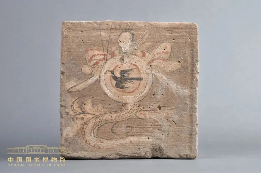 伏羲和女娲是中国古代神话中的人类始祖。此画像砖呈方形,四周饰白色边框。画面中央用白色涂底、彩绘一伏羲图像。伏羲人首蛇身,右手持规,头戴山形冠,胸部有日轮,中有呈飞翔状墨鸟,为传说中运载日至日出的阳鸟,又称金乌。