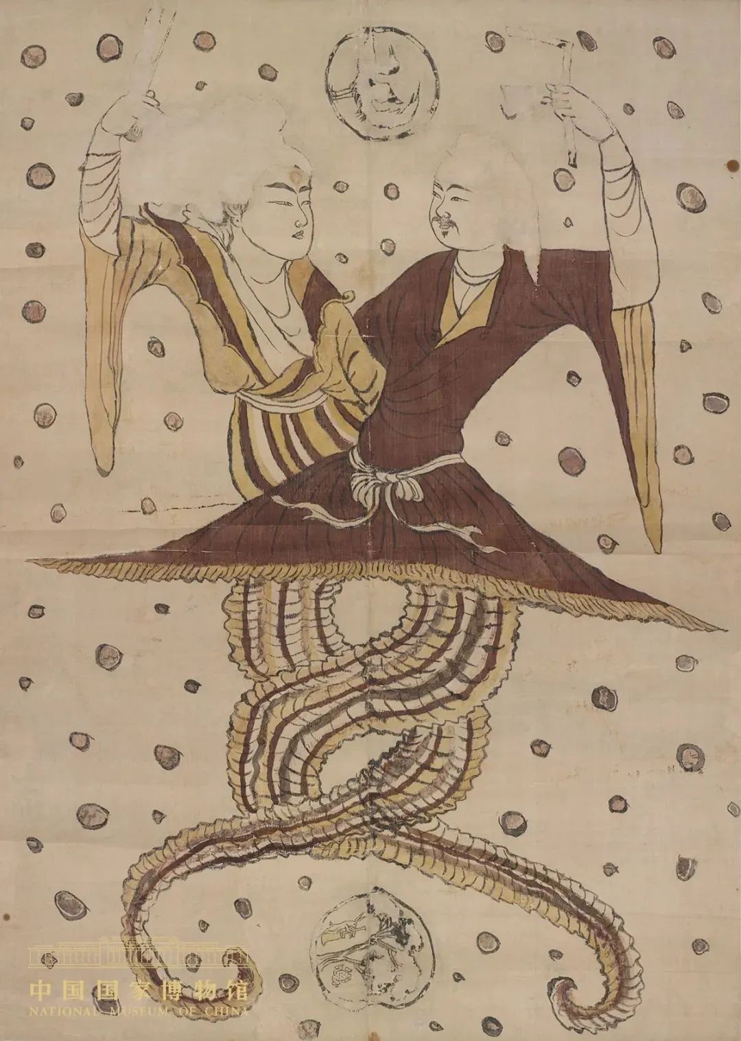 画中伏羲、女娲皆人首蛇身,手持规、矩,上身相拥,着唐代服装,下身相互缠绕。头顶绘内含金乌的太阳,脚下绘内含蟾蜍、桂树和捣药玉兔的月亮,身后是漫天星辰。在新疆吐鲁番地区的许多唐代墓葬中出土了伏羲女娲交尾像,体现了中原与当地的文化交流。