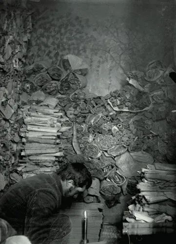 伯希和在藏经洞里挑选经卷,Charles Nouette 拍摄,1908年
