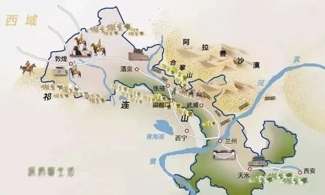 这两个民族都是高鼻凹目,头发是棕红色或者金色,眼睛多蓝眼和碧眼,游牧于祁连山的牧场之下。随着匈奴打击月氏引发的民族多米诺骨牌,还有汉武帝对匈奴的河西走廊之战,这里最终落入了汉朝手里,“西规大河,列郡祁连武威张掖酒泉敦煌四郡的设立,让这里成为了汉代连接西域的通道。