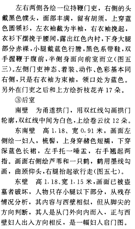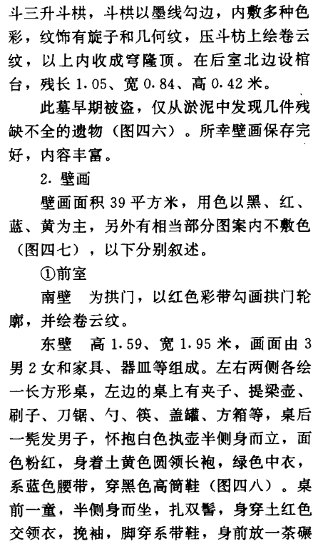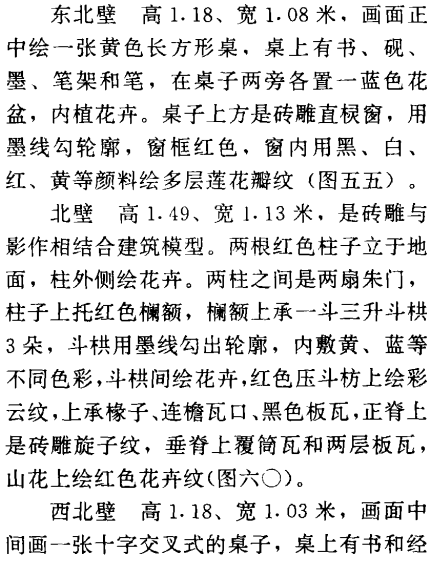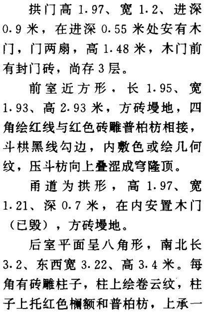 墓门拱形,拱门外是仿木结构的门楼,高3.6、现存宽度2.25米,右侧已残缺(图四五)。拱门两侧为抱框,用墨线勾轮廓,门楣上有门簪2个,然后是红色普柏枋,枋上承斗栱,斗栱用墨线勾轮廓,内绘旋子图案,再上为压斗枋、椽、压椽枋、飞子、压飞枋,枋上承连檐瓦口,瓦当黑色,阴刻云纹。瓦顶斜坡形,上起脊,为两层卧砖,错缝砌成。