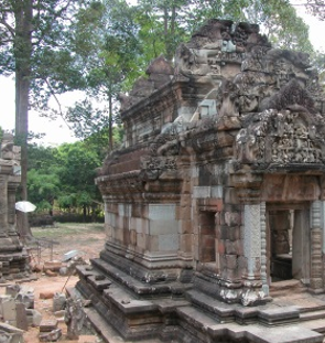 周萨神庙位于吴哥城以东500米的道路南侧,建于公元11世纪末至12世纪上半叶。1998年2月,国家文物局正式指派中国文物研究所(中国文化遗产研究院前身)承担周萨神庙的保护修复工作,这是中国政府首次参与大规模文物保护国际合作项目。周萨神庙保护维修工程于2000年3月正式开工,2008年12月竣工验收。中国援柬保护吴哥工作队采用原物重建的方法,对周萨神庙除西楼门外的8座建筑进行整体维修。