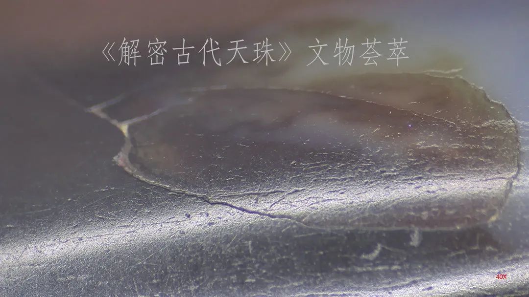 图八 另一处珠体在40倍显微镜下的成像图八是另一处珠体在40倍显微镜下的成像,可看见一些微细沁裂纹的旁边有土蚀斑现象,这是珠体表层的微晶体在漫长的风化淋滤过程中逐渐疏松、脱落后形成的自然形态。在土蚀斑的凹坑中和相对较粗的沁裂纹中还胶结附着有壤液成分。另外,还可观察到隐约的橘皮纹现象。