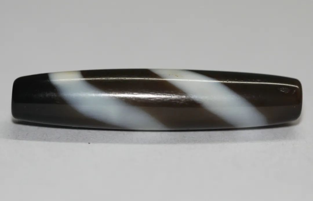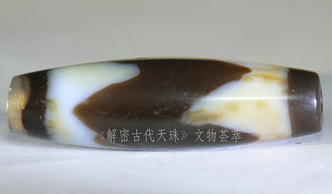 图一 “虎牙”天珠这颗天珠的珠体原本为半透明的白玉髓,2000多年前的工匠运用当时的高科技——蚀花工艺在白玉髓珠的表面进行了人工装饰,从而使珠子看上去具有了“黑”(深褐色)白相间的纹饰。