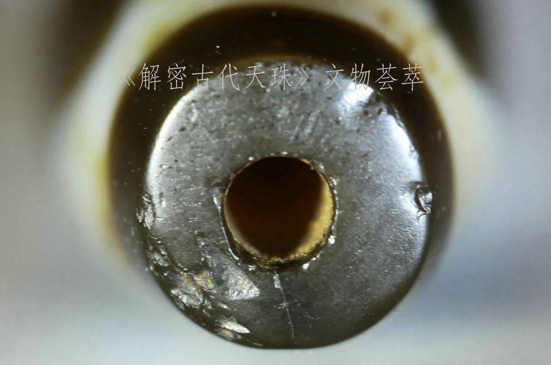 最后为珠子钻孔,钻孔时工匠需先将珠子固定好,然后将钻管安放在钻孔处,之后再不断添加解玉砂和水进行钻孔,因此珠子的孔道内壁就留下了游离状的解玉砂琢磨过后的旋痕,这些旋痕相对浅窄、细小且不连续,孔壁上还有包浆覆盖或附着有壤液成分,见图三。