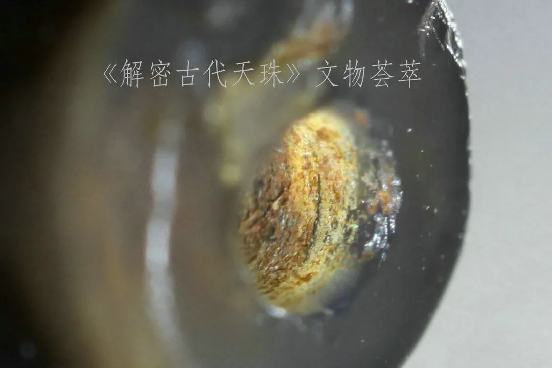 当考古队员小心翼翼地将它唤醒时,他们看到的已不再是这颗天珠最初的模样,而是有多种受沁现象叠加在成珠时的珠体之上,这些受沁现象是珠体在埋藏过程中经历了漫长的风化淋滤作用和渗透胶结作用后的产物,具有一定的系统规律性, 也是珠子历经漫长岁月洗礼的有力鉴证。
