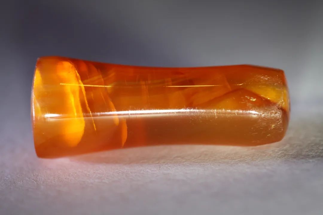 其次,通过打磨和抛光进行珠子的表面处理,即在琢磨成型的过程中使用不同粒度的解玉砂来反复打磨珠体,待珠子表面被打磨得相对平整光滑后,再用更加细小的解玉砂对其进行抛光前的精细打磨,之后再用极其细腻的解玉砂或竹片、兽皮等材料来抛光玉髓珠体,见图二;