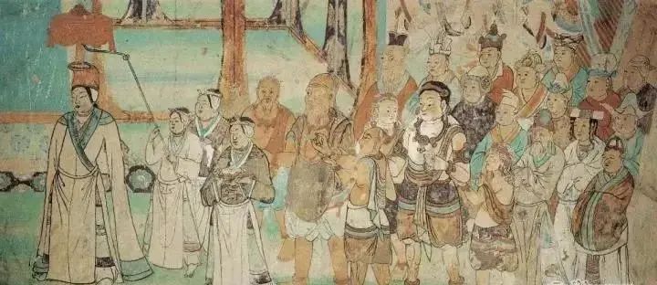 吐蕃赞普礼佛图,绘制了吐蕃首领和西域各国王子的形象接下来一行人就要进入戈壁沙漠了。只见大漠中风沙蔽日,黑烟漫天,而且很难寻找水源,人们只能通过有经验的骆驼找到地下水源,然后挖地,将湿润的沙土涂抹在胸口来止渴。接下来一行人又渡过了名叫“陷河”的河流,也许描述的是岸边的流沙具有极强的吞噬力,为了渡过这里,人们需要砍伐柽柳作为桥梁渡河;经过陷河之后,一行人到了于阗国设置的地方行政机构绀州,最后来到了位于和田附近的于阗王城,此地距离后晋国都已经有九千五百里了。