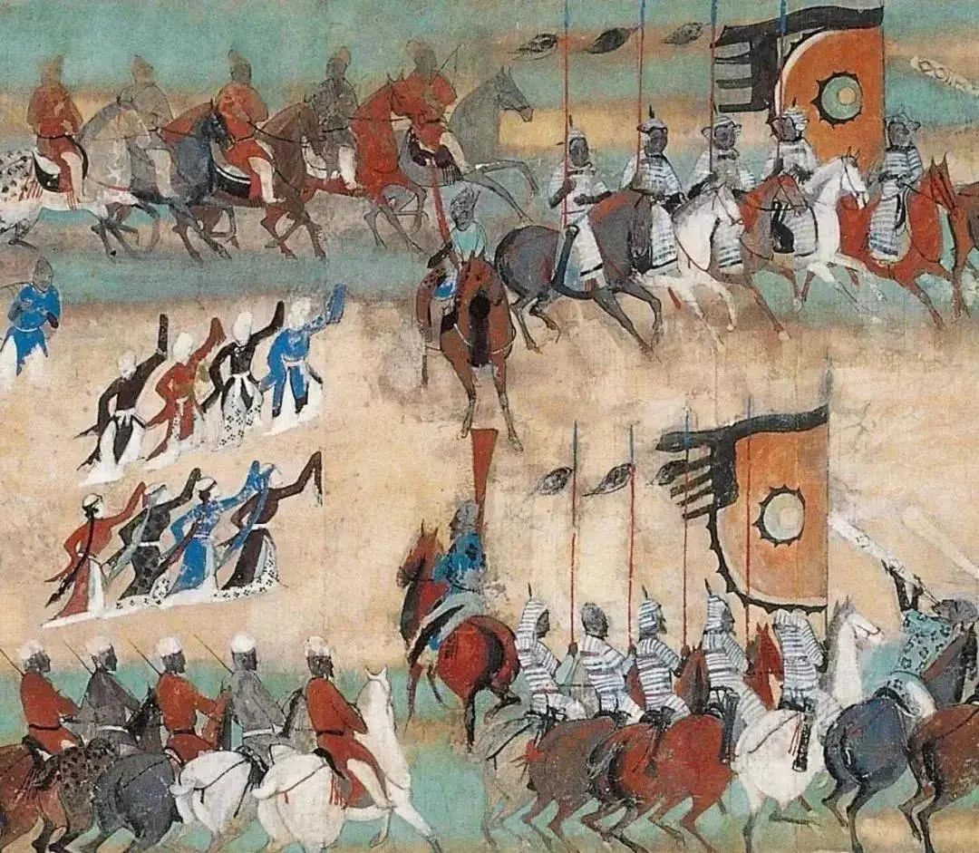 张义潮统军出行图中位于队伍中间的,就是吐蕃族舞者在前后拜舞;画面右下角的花衣骑马鼓吹手是回鹘人,体现了当年河西走廊丰富的民族构成使团西出玉门关之后,就进入了吐蕃人的地盘,这些人是曾经强盛一时的吐蕃帝国留在河西和西域地区的残部,现在的吐蕃人大都以部落为单位分散着征战,虽然能够成为地方上的恶霸,但是已经无法作为一个强大的政治实体对各方势力产生影响了,他们只能为归义军,甘州回鹘或者于阗等各方势力作为雇佣军而战。这些男子喜欢穿戴汉式的冠帽,但是妇女系着编发,因为生活在高原地带的原因面颊红扑扑,女子还喜欢佩戴名叫瑟瑟的绿松石宝珠,一旦他们发现了一颗上好的宝珠,就愿意用一匹良马来换它。