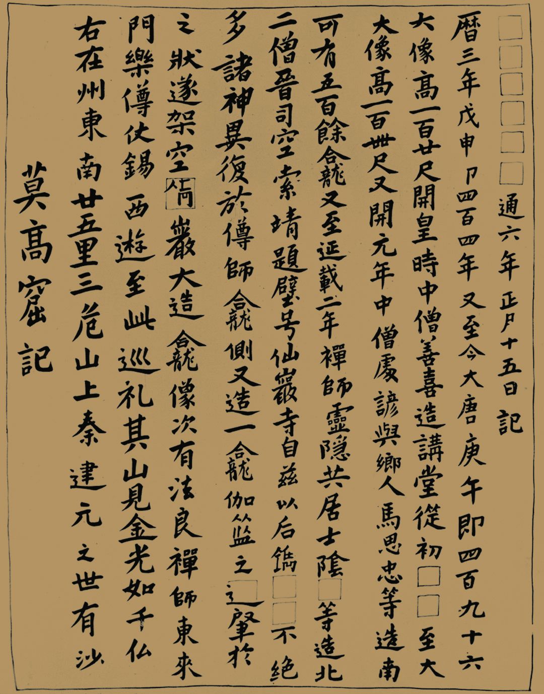在莫高窟第423窟内,有一片隋代刻制的墨书题记《莫高窟记》。仔细观察,由于年代久远风沙久拂,题记正文已经模糊不可见,但标题“莫高窟记”四字却十分清晰。这是最早见的莫高窟之名,也是敦煌莫高窟的名字之来由。佛家有言,修建佛洞功德无量,莫者,不可能、没有也,莫高窟的意思,就是说没有比修建佛窟更高的修为了。从世俗的层面理解,莫高窟也可以理解为没有比此水平更高的石窟了。