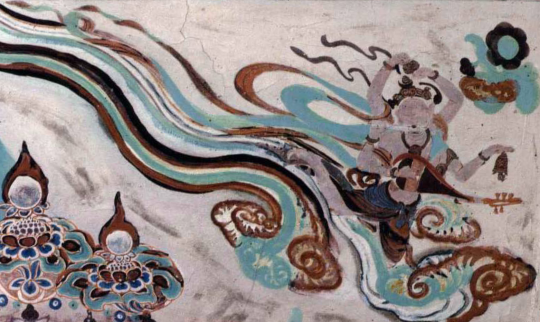 莫高窟的壁画上,处处可见漫天飞舞的美丽飞天——敦煌市的城雕也是一个反弹琵琶的飞天仙女的形象。飞天是侍奉佛陀和帝释天的神,能歌善舞。墙壁之上,飞天在无边无际的茫茫宇宙中飘舞,有的手捧莲蕾,直冲云霄;有的从空中俯冲下来,势若流星;有的穿过重楼高阁,宛如游龙;有的则随风悠悠漫卷。画家用那特有的蜿蜒曲折的长线、舒展和谐的意趣,为人们打造了一个优美而空灵的想象世界。